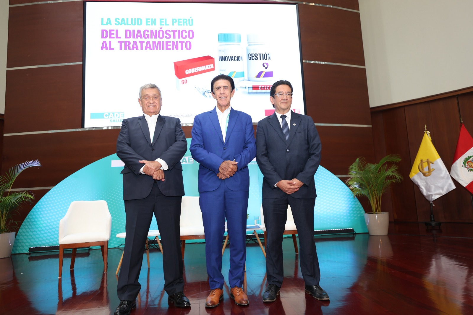 La sesión inaugural contó con la participación de Gonzalo Galdos, presidente de IPAE Acción Empresarial; Jorge Ruiz, presidente de CADE Salud 2026 y Julio del Valle, Rector de la Pontificia Universidad Católica del Perú.