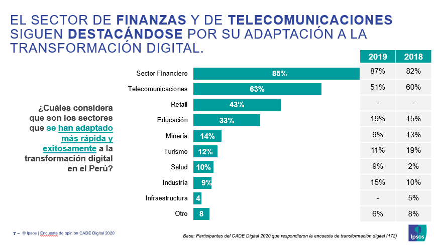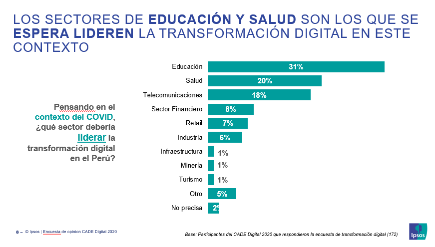 La reciente edición de CADE Digital 2020, evento organizado por IPAE Asociación Empresarial, tuvo como objetivo transmitir el sentido de urgencia y velocidad que debe tener el Perú para lograr la transformación digital en sectores prioritarios. Por ello, en el #CADEx: Conclusiones de #CADEdigital, se presentaron los principales hallazgos y propuestas para encontrar el mejor camino en este ámbito y más, en la actual situación de la pandemia por el COVID – 19. Participaron Elena Conterno, presidenta de IPAE; Pedro Cortez, presidente de Comité de CADE Digital, Marushka Chocobar, secretaria de la Secretaría de Gobierno Digital de la Presidencia del Consejos de Ministros y Javier Álvarez, Director Senior de Trends de Ipsos.